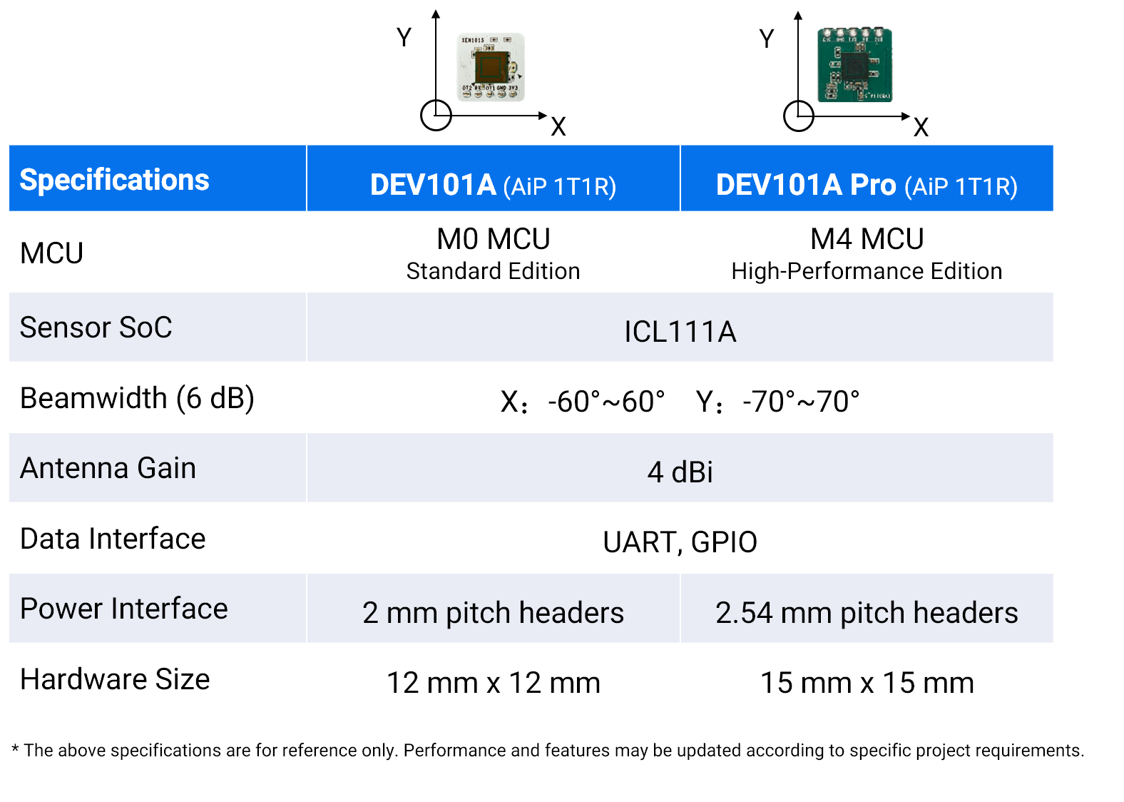 DEV101A development kits are integrated with ICL111A AiP 1T1R mmWave sensor SoC, with options for the M0 MCU Standard Edition or M4 MCU High-Performance Edition. The module adopts an ultra-mini 12 mm x 12 mm / 15 mm x 15 mm form factor, supporting flexible integration into compact systems.