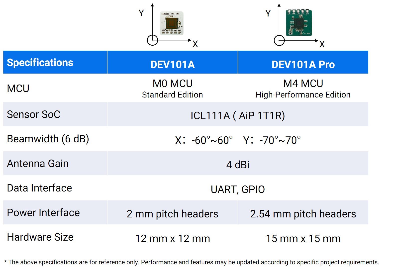 DEV101A Pro development kits are integrated with ICL111A AiP 1T1R mmWave sensor SoC.