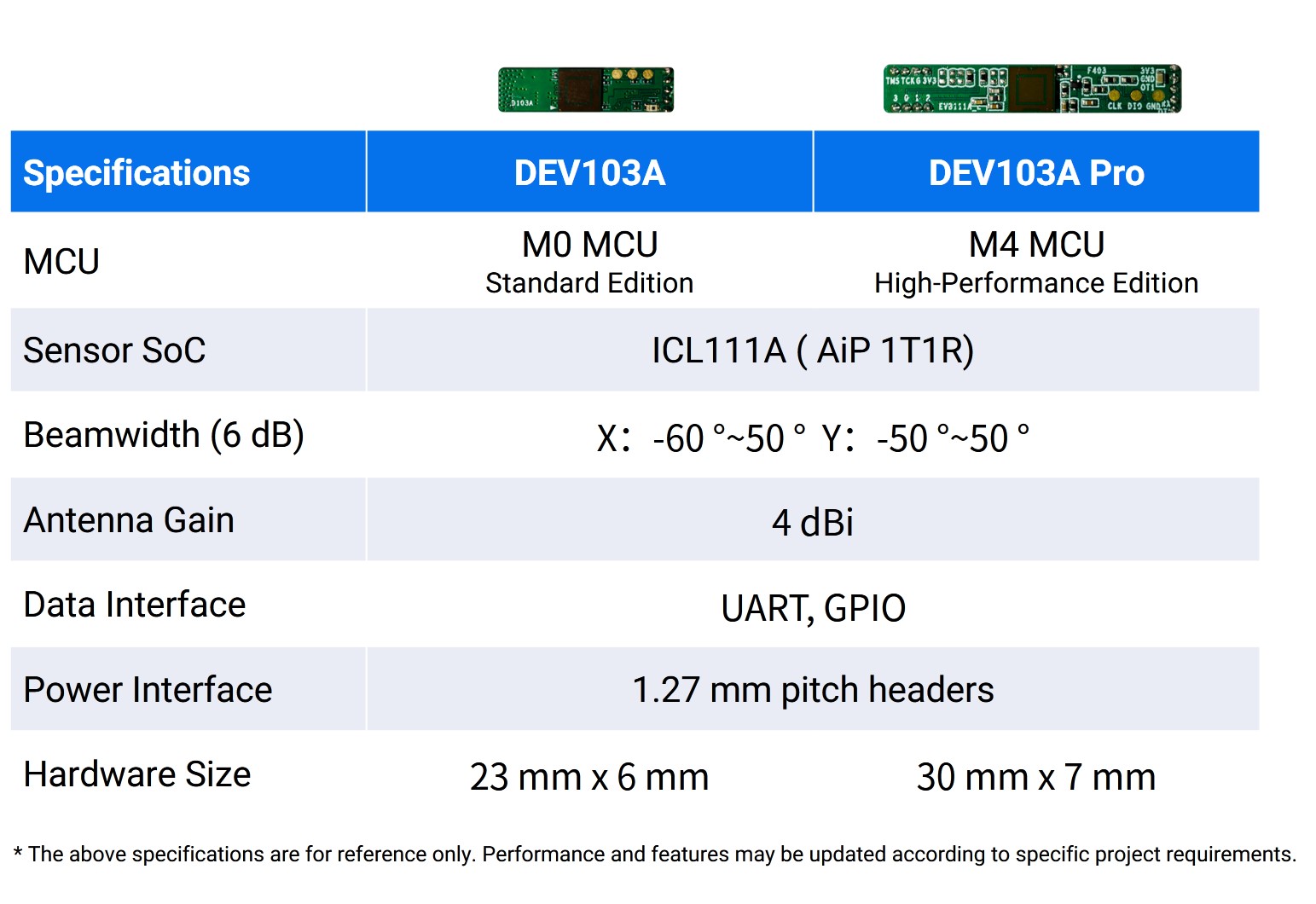DEV103A Pro development kits are equipped with ICL111A AiP 1T1R mmWave sensor SoC.
