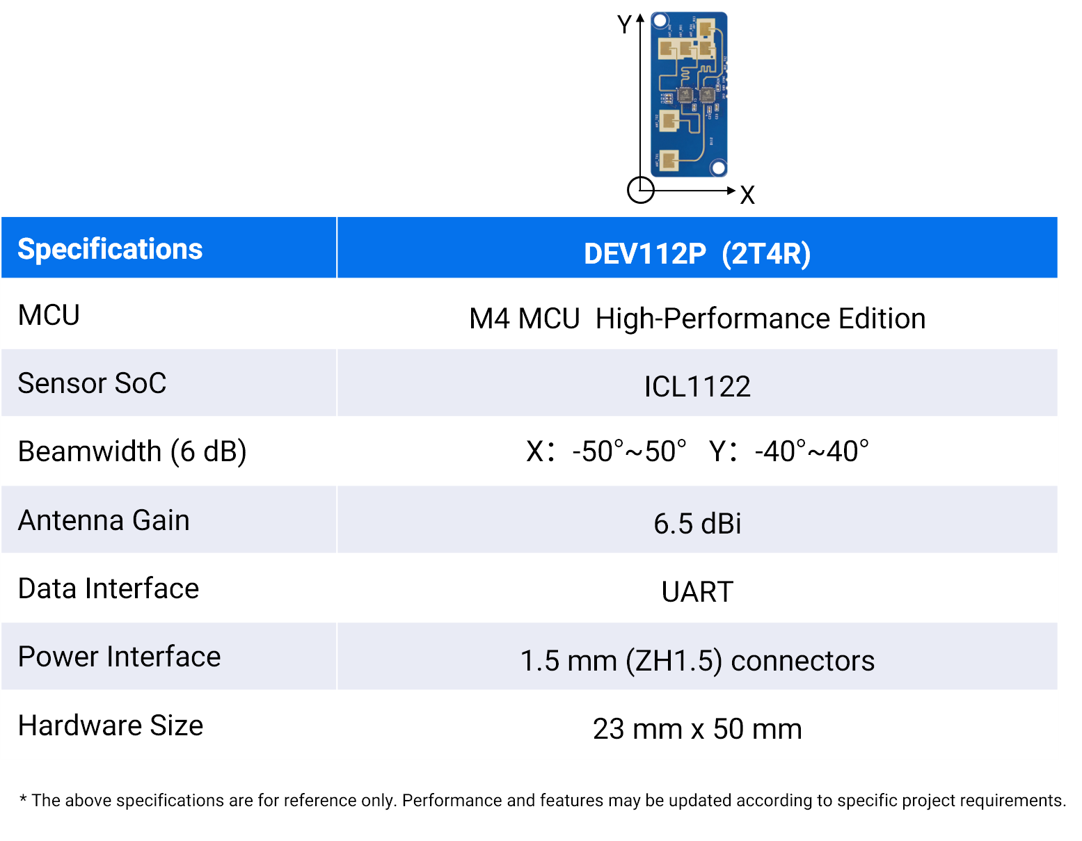 DEV112P development kit is based on two ICL1122 1T2R mmWave sensor SoCs, offering M4 MCU High-Performance configurations. It comes in 23 mm x 50 mm layout options.