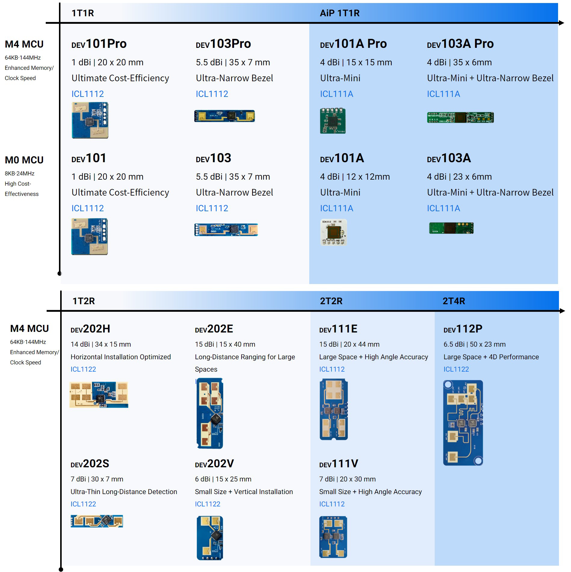 DEV202 series development kits are based on ICL1122 1T2R mmWave sensor SoC, offering M4 MCU High-Performance configurations. They come in 15 mm x 40 mm / 15 mm x 34 mm / 7 mm x 30 mm / 15 mm x 25 mm layout options.