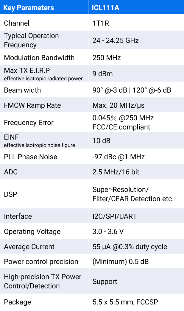 The ICL111A stands as an unique advantageous 24 GHz mmWave AIP sensor SoC with patent protected AIP antenna design and μA-level ultra-low power consumption. This chip presents a fully integrated mmWave sensing solution, consisting of mmWave antenna, full transceiver and signal processing system. ICL111A requires fewer external peripherals, brings much smaller size of sensor modules, provides more convenience for design and production, has better environmental adaptability.