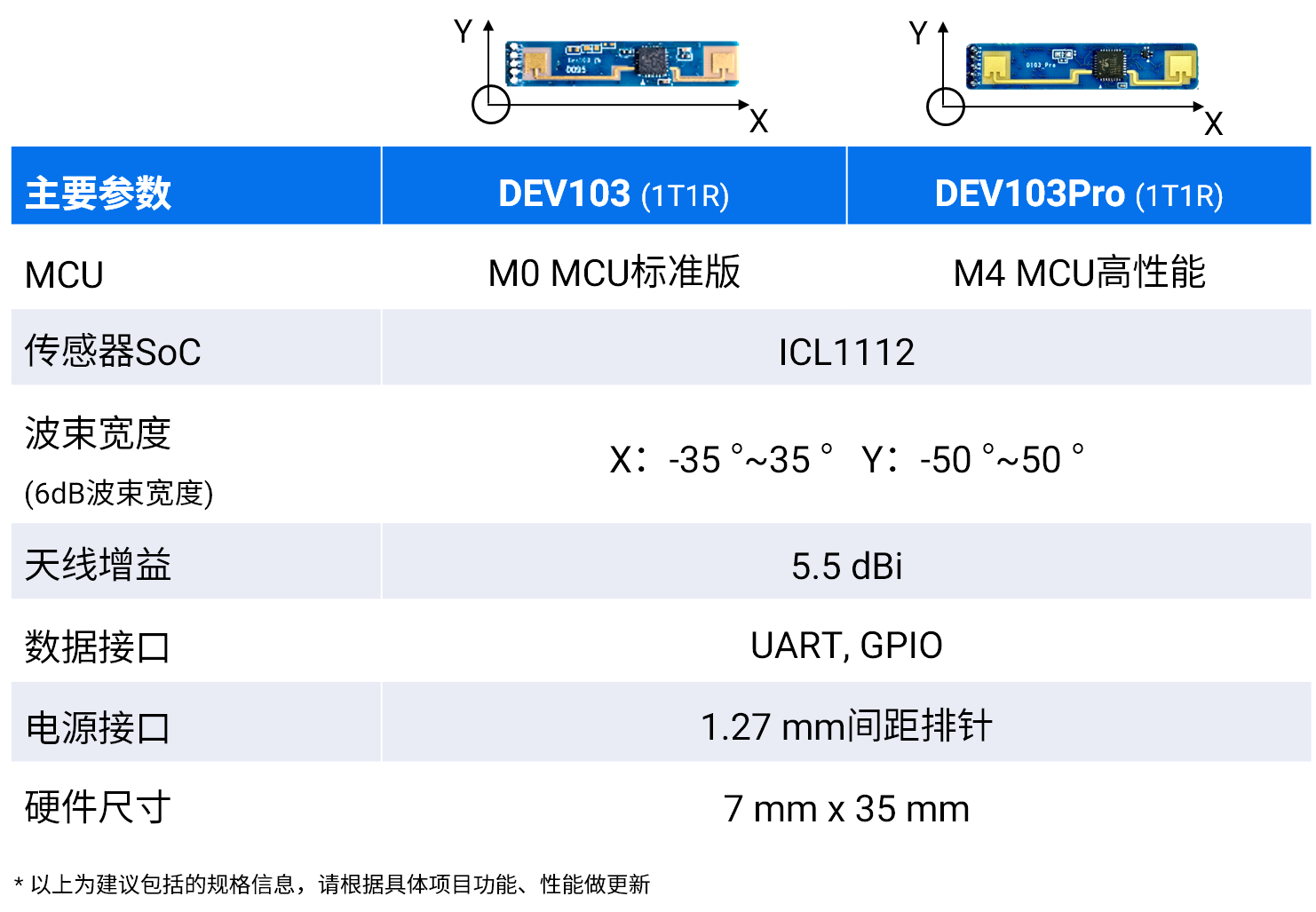 DEV103系列开发套件搭载矽典微1T1R毫米波传感器芯片ICL1112,可选择标准版 M0 MCU/性能版 M4 MCU,采用35mm x 7mm 窄边框尺寸设计。