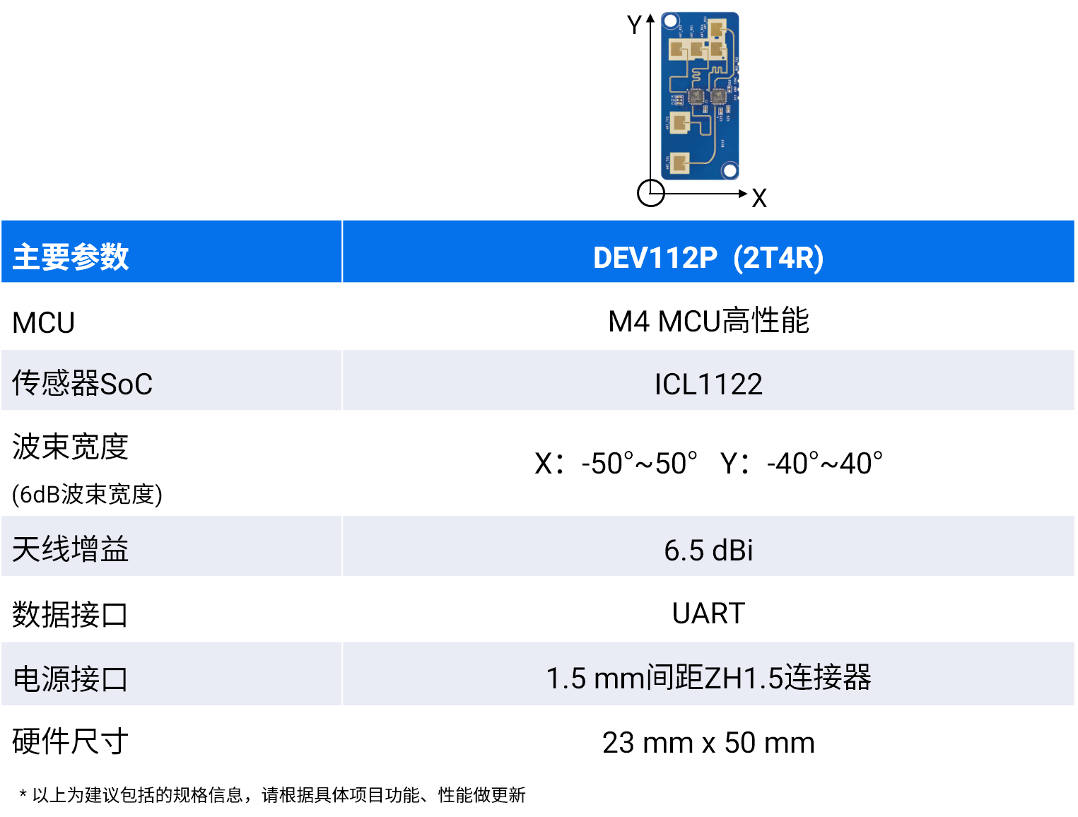 DEV112P开发套件搭载2颗矽典微1T2R毫米波传感器芯片ICL1122,搭载性能版 M4 MCU,采用23 mm x 50 mm尺寸设计。