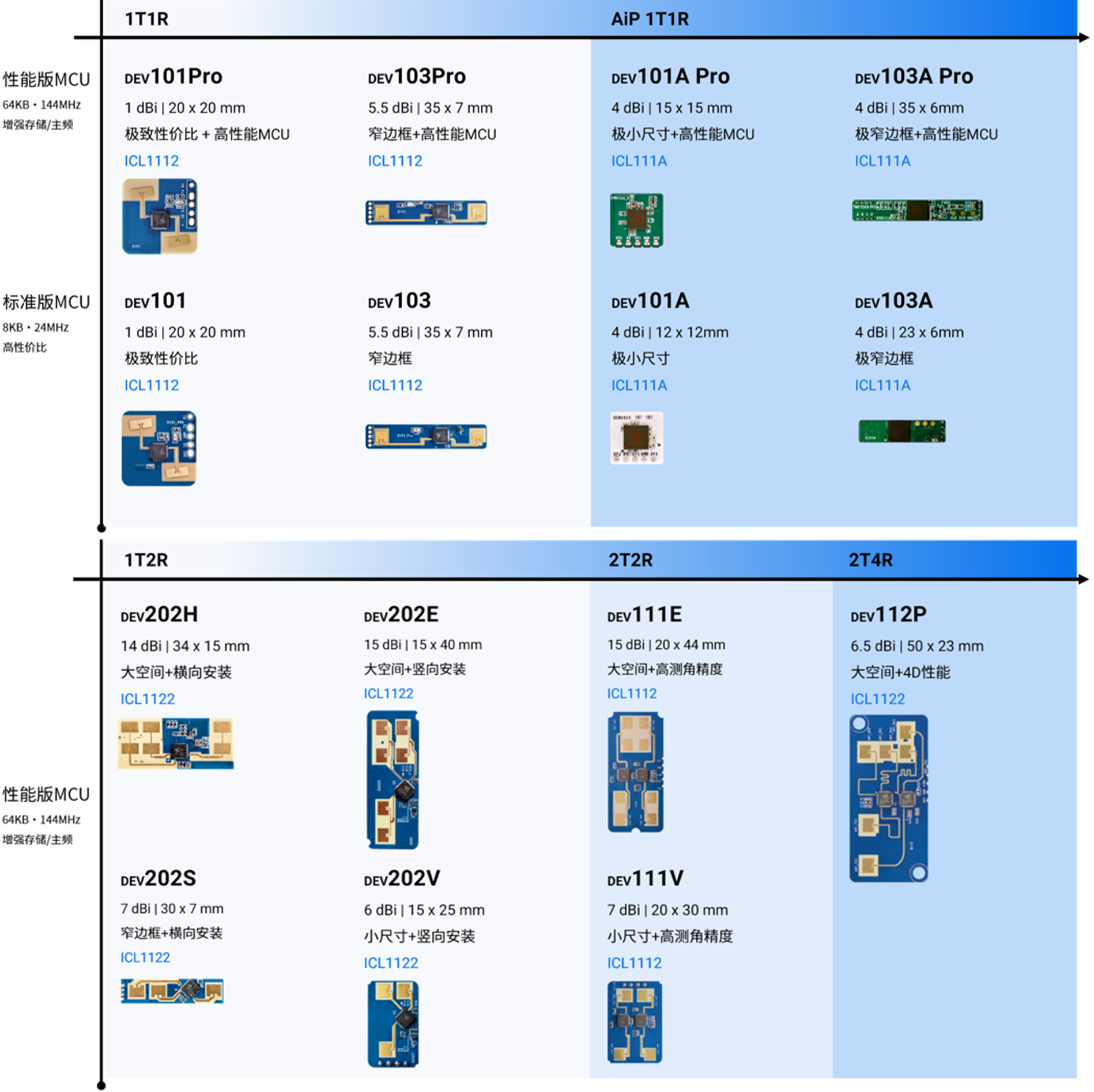 DEV202系列开发套件搭载矽典微 1T2R毫米波传感器芯片ICL1122,搭载性能版 M4 MCU,采用15 mm x 40 mm / 15 mm x 34 mm / 7 mm x 30 mm / 15 mm x 25 mm尺寸设计。