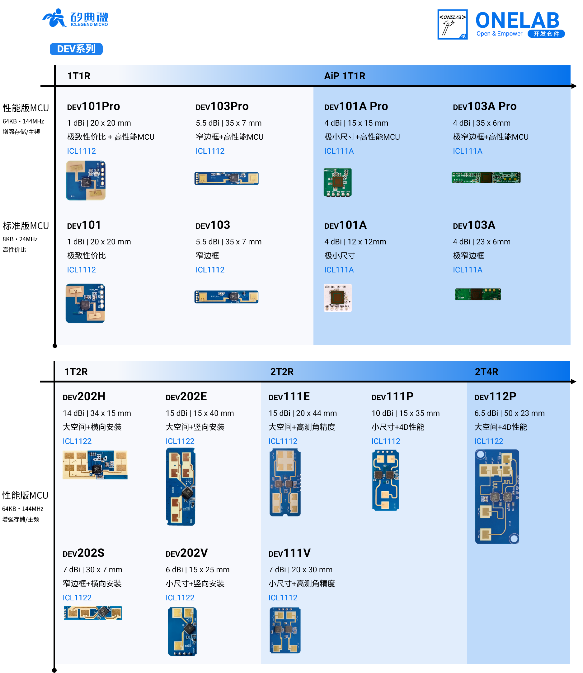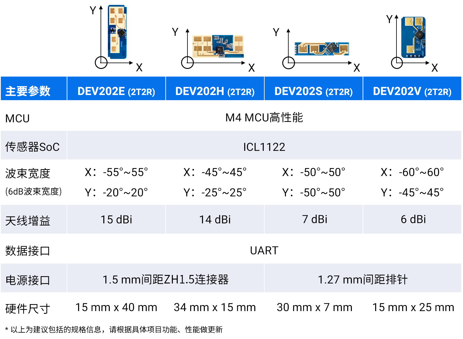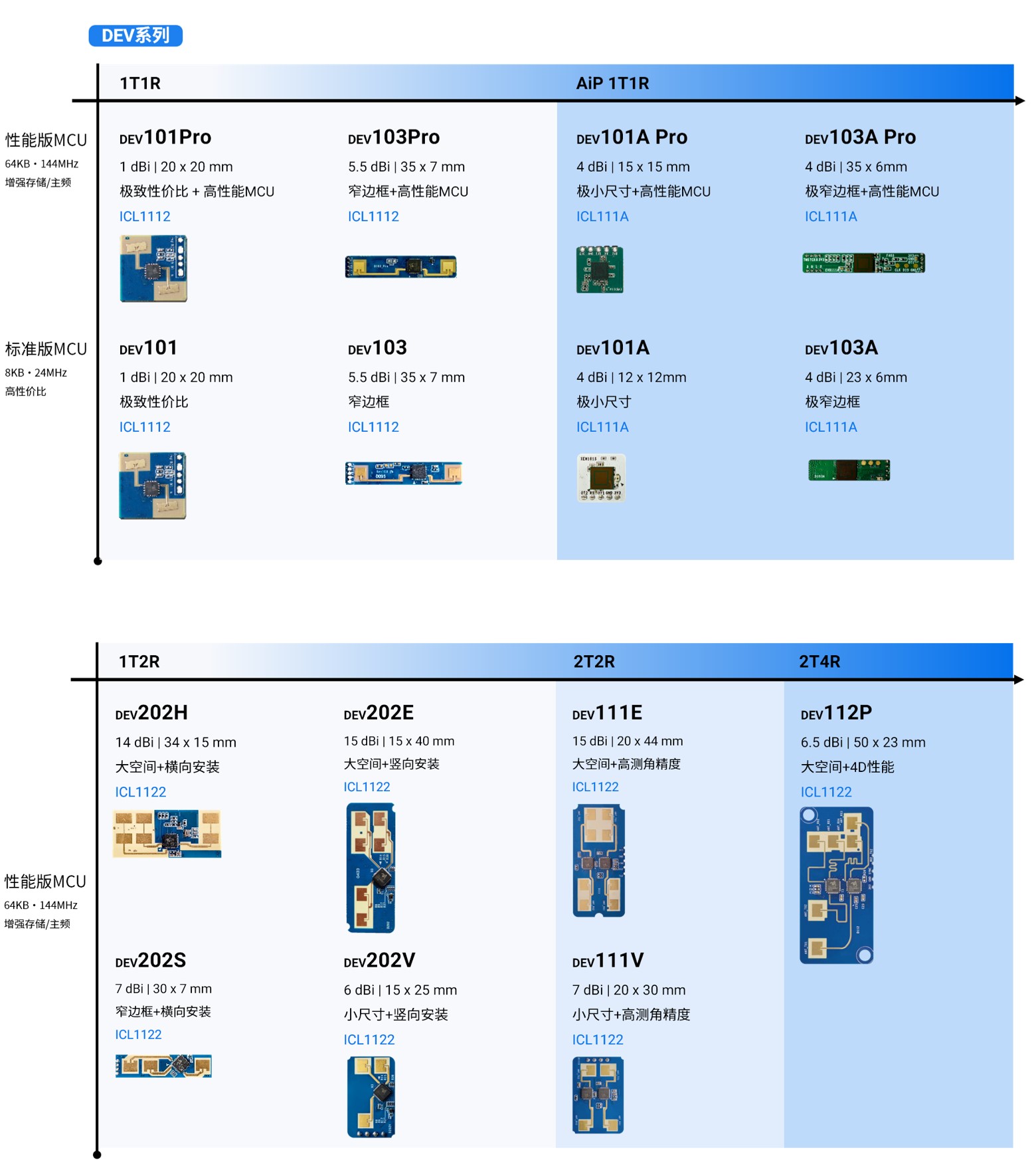 DEV202系列开发套件搭载矽典微 1T2R毫米波传感器芯片ICL1122,搭载性能版 M4 MCU,采用15 mm x 40 mm / 15 mm x 34 mm / 7 mm x 30 mm / 15 mm x 25 mm尺寸设计。