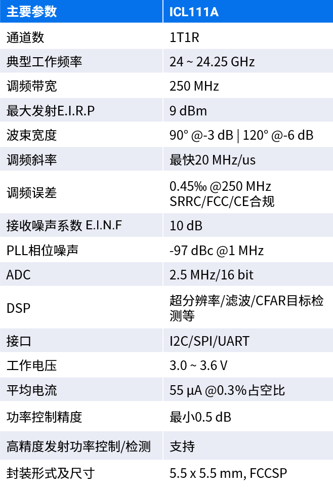 ICL111A是独具优势的24GHz单发单收毫米波AIP传感器芯片,独特专利保护的小型化AIP天线设计,具备μA级超低功耗。芯片完整集成了毫米波传感器的天线、射频收发机和信号处理系统。外围元器件更少,模组尺寸更小,开发生产更便利,环境适配性更强。