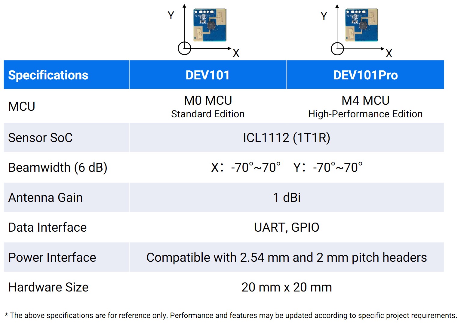 DEV101A development kits are integrated with ICL111A AiP 1T1R mmWave sensor SoC.