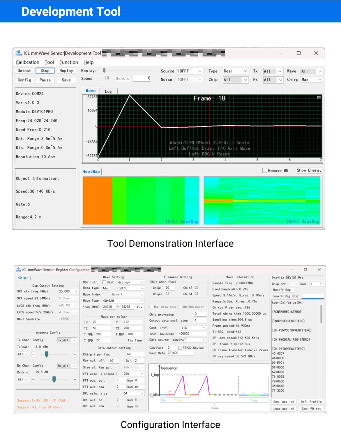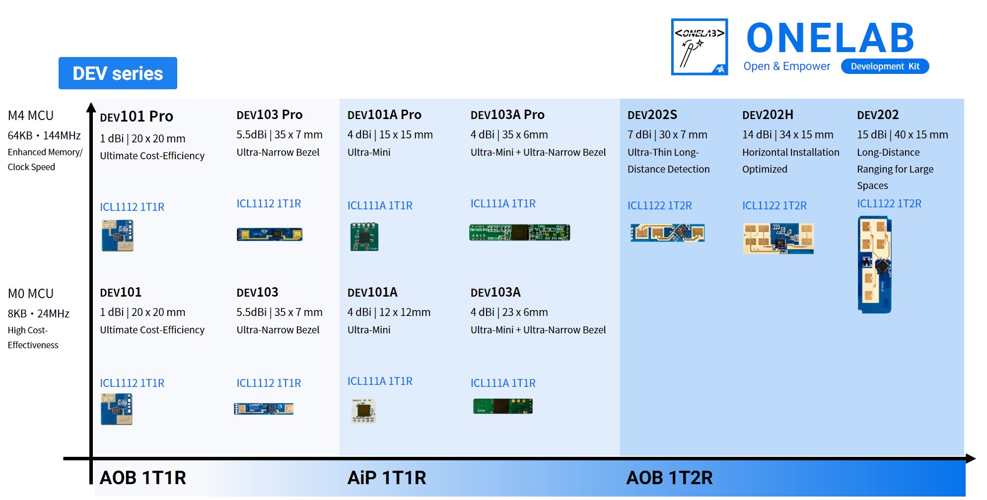 DEV202/202S/202H development kits are based on ICL1122 1T2R mmWave sensor SoC, offering M4 MCU High-Performance configurations.