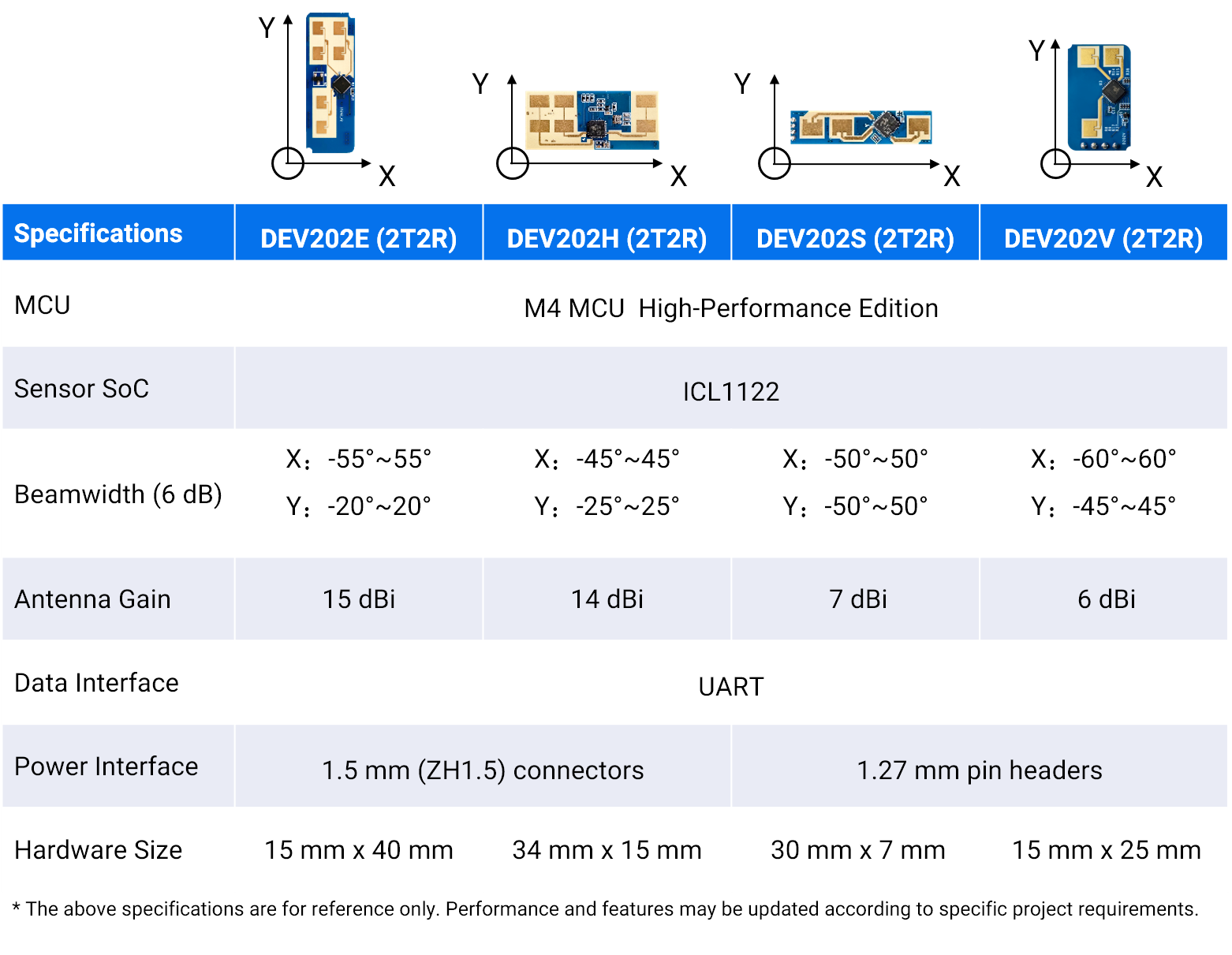 DEV202 series development kits are based on ICL1122 1T2R mmWave sensor SoC, offering M4 MCU High-Performance configurations. They come in 15 mm x 40 mm / 15 mm x 34 mm / 7 mm x 30 mm / 15 mm x 25 mm layout options.