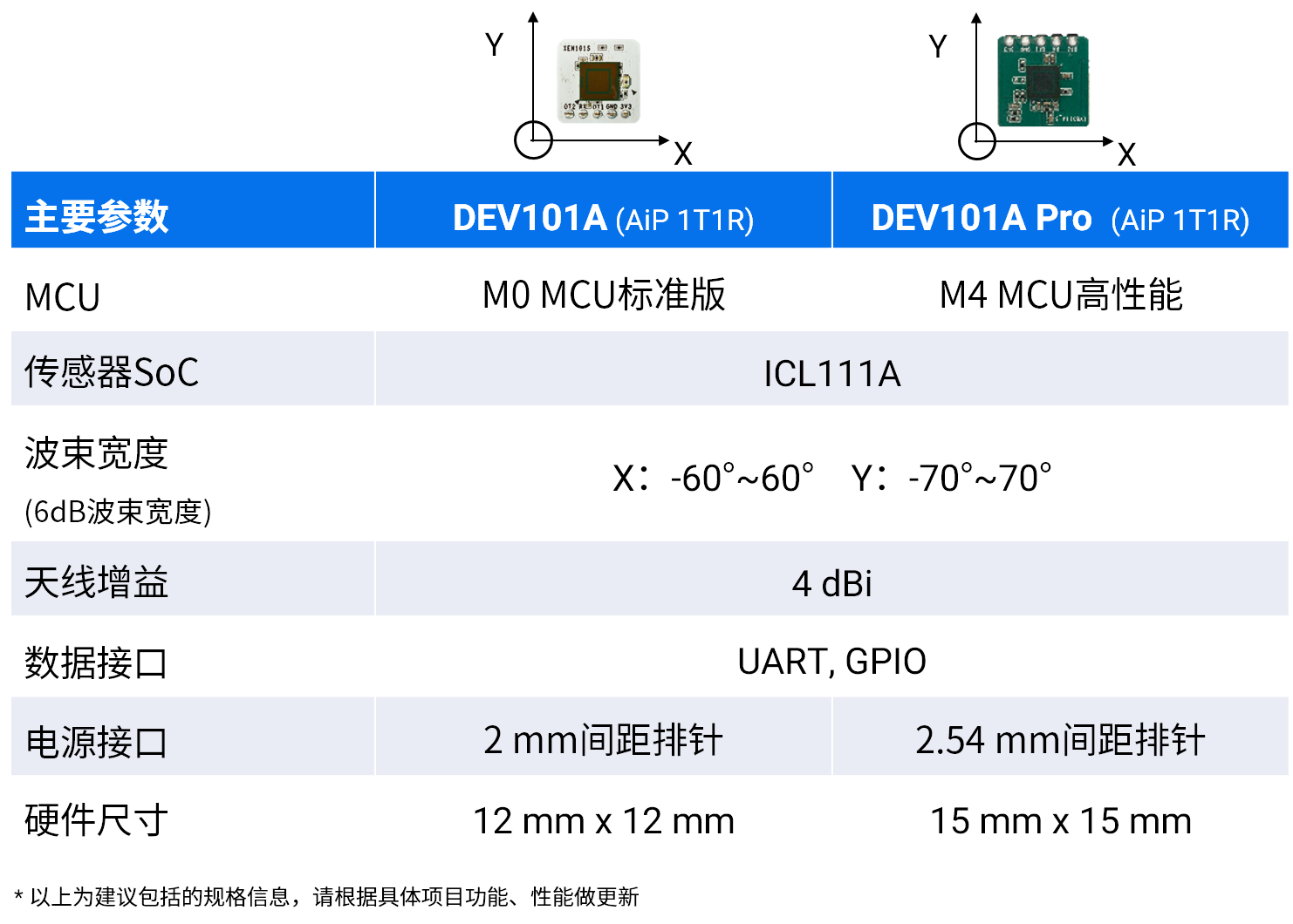 DEV101A系列开发套件搭载矽典微AiP 1T1R毫米波传感器芯片ICL111A,可选择标准版 M0 MCU/性能版 M4 MCU,采用12 mm x 12 mm / 15 mm x 15 mm 极小尺寸设计。
