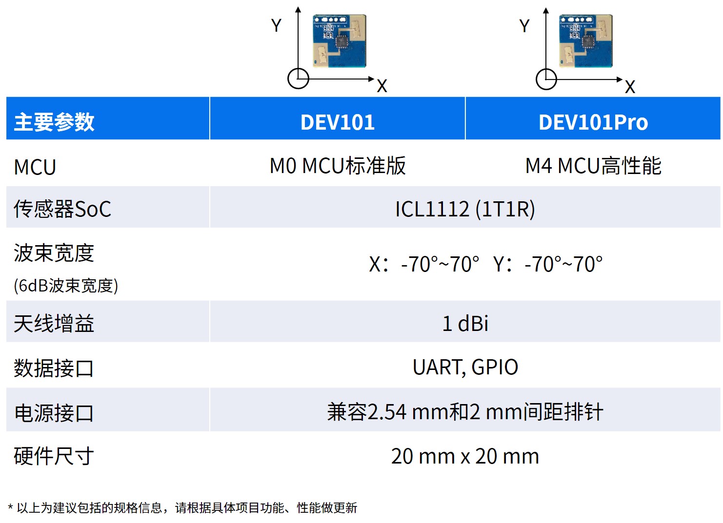 DEV101系列开发套件搭载矽典微1T1R毫米波传感器芯片ICL1112。
