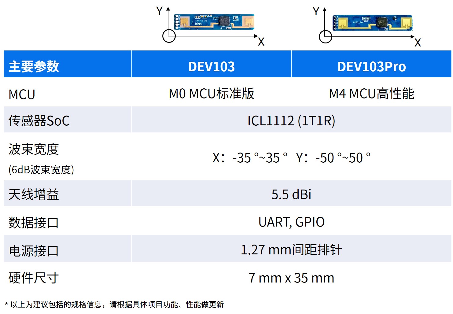 DEV103系列开发套件搭载矽典微1T1R毫米波传感器芯片ICL1112。