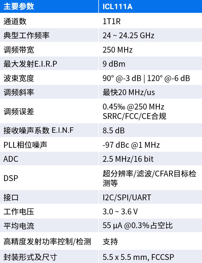 ICL111A是独具优势的24GHz单发单收毫米波AIP传感器芯片,独特专利保护的小型化AIP天线设计,具备μA级超低功耗。芯片完整集成了毫米波传感器的天线、射频收发机和信号处理系统。外围元器件更少,模组尺寸更小,开发生产更便利,环境适配性更强。